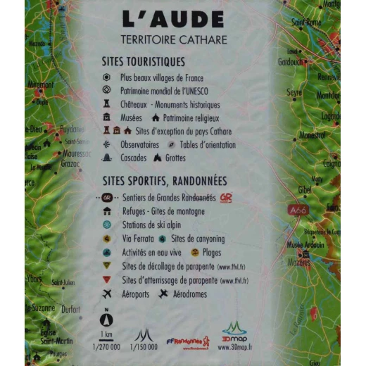 Les couleurs et les légendes de la carte 3D permettent de repérer rapidement les monuments historiques et les hauts lieux touristiques, les lieux culturels, les stations de ski, les GR, les sites de décollage/atterrissage de parapente et bien plus encore. De plus, la qualité de l’information et l'exploitation de données bathymétriques sont poussées à l'extrême pour faciliter la lecture afin de préparer un périple de l’Aude à pied, à vélo, une sortie avec une aile ou un road trip. Très lisible et ludique, cette carte 3D au 1 : 215 000 sera un avantage pour se rendre compte des distances, du dénivelé et de la durée d’une randonnée par exemple.