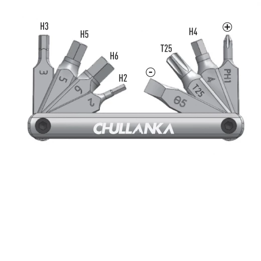 Le Compact Tool 8 de Chullanka est un outil 8 fonctions compact, ultra plat et très léger : seulement 76 grammes. Il sera vite placé dans les sacoches de vélo les plus compactes. Fonctions: Hex : 2, 3, 4, 5, 6 mm, torx 25, tournevis plat et tournevis cruciforme. Ses bras en aluminium et ses outils en chrome-vanadium vous garantissent une solidité sur le long terme.