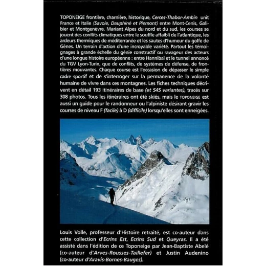 Ce toponeige de Cerces, Thabor, Ambin couvre l’espace entre les cols du Galibier et du Mont-Cenis. Celui-ci comprend de part et d’autre du col de Fréjus, deux massifs : à l’ouest l’ensemble Cerces-Thabor et à l’est l’ensemble Ambin-Scolette. Il contient des itinéraires sur tous les versants : au nord la Maurienne, au sud, le Briançonnais et le val Susa. Les fiches techniques décrivent en détail 193 itinéraires de base (et 545 variantes), tracés sur 313 photos. 352 pages de projets !