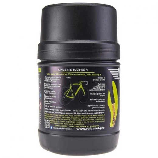 Nettoyez, dégraissez, protégez et faites briller votre vélo de route, gravel, VAE ou VTT en un seul grâce à la boîte de 60 Lingettes Nettoyantes / Dégraissantes de la marque Vulcanet. Les lingettes Vulcanet permettent d’enlever les salissures du cadre et de dégraisser la transmission de la chaîne aux pignons ainsi que les roues sans eau, sans brosses et sans une multitude de produits.
